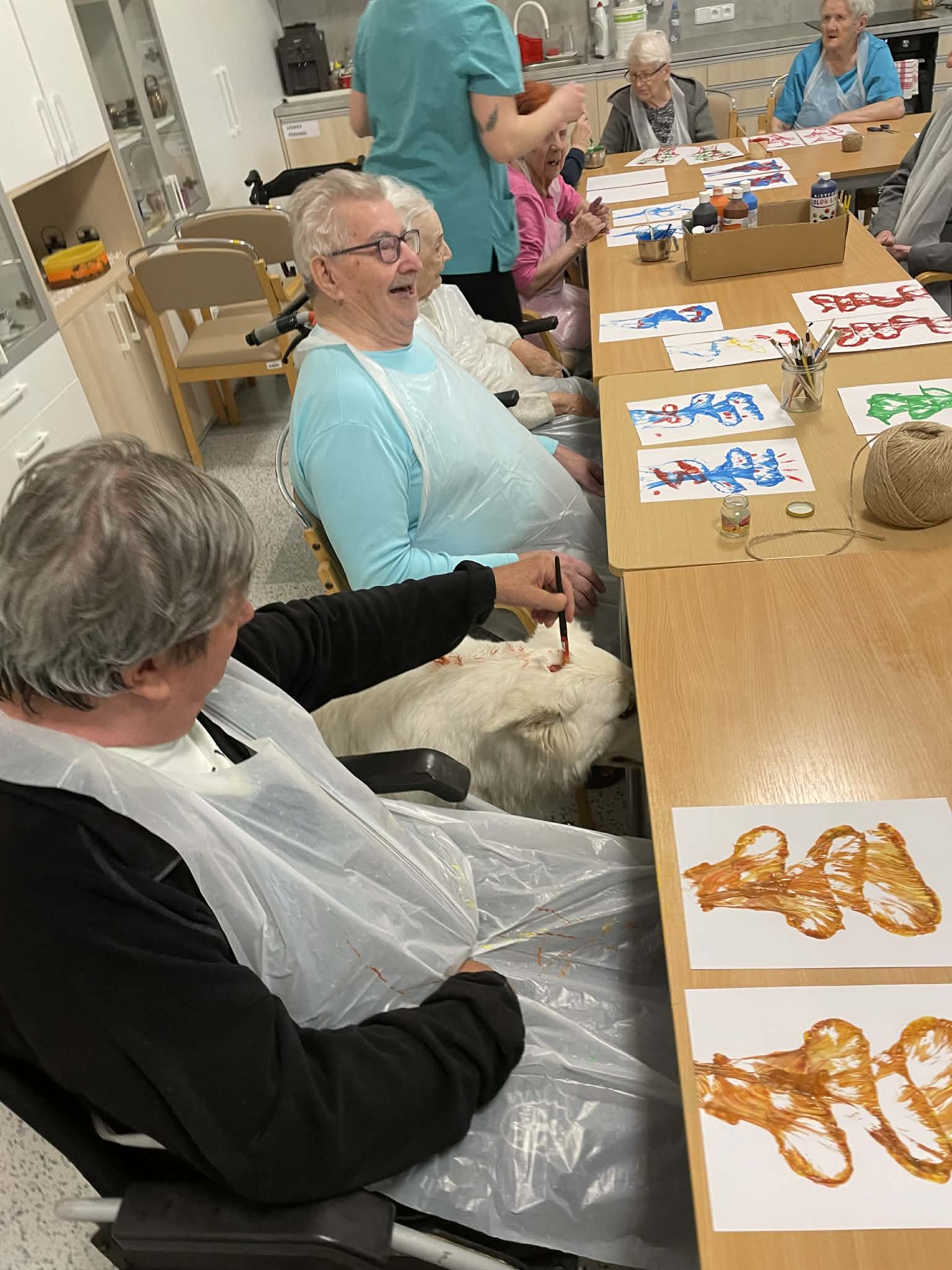 V pondělí jsme se společně s klienty pustili také do velmi zajímavého malování pomocí provázků.
